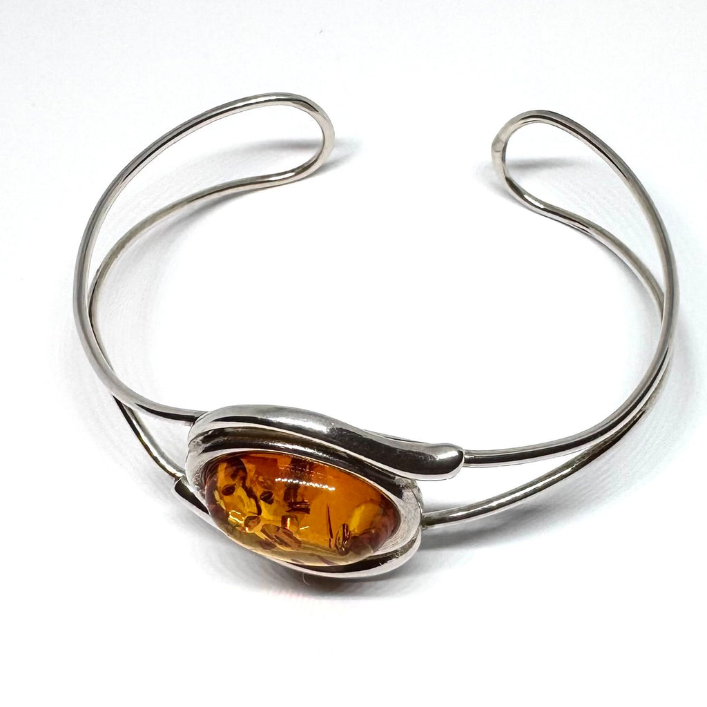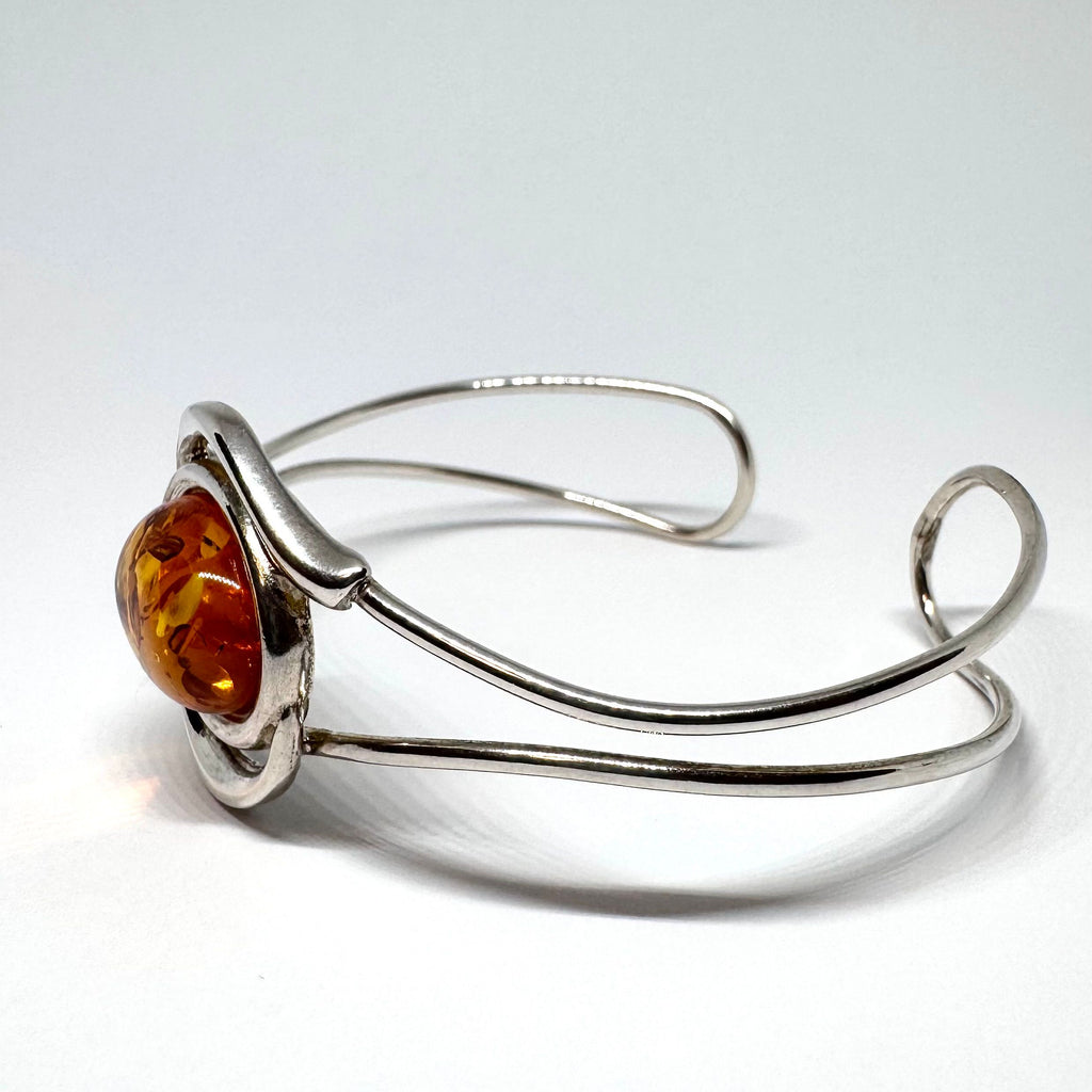 This lightweight silver cuff bracelet is featuring a beautiful Baltic amber cabochon in popular cognac colour and with many air-bubbles.