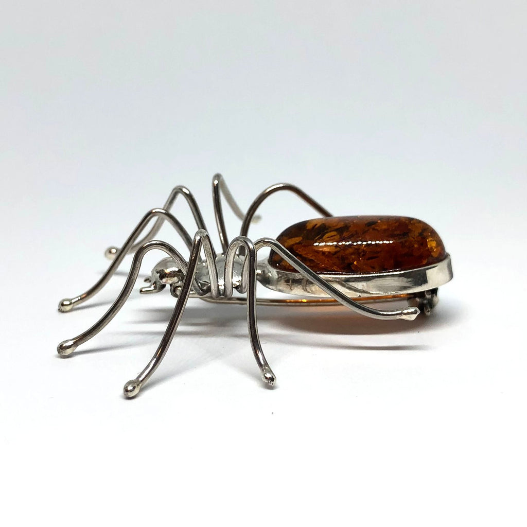 This is a one of a kind spider brooch handmade in silver with a big Baltic amber stone.
