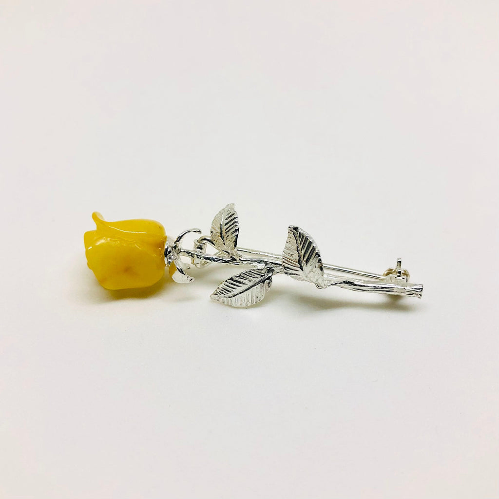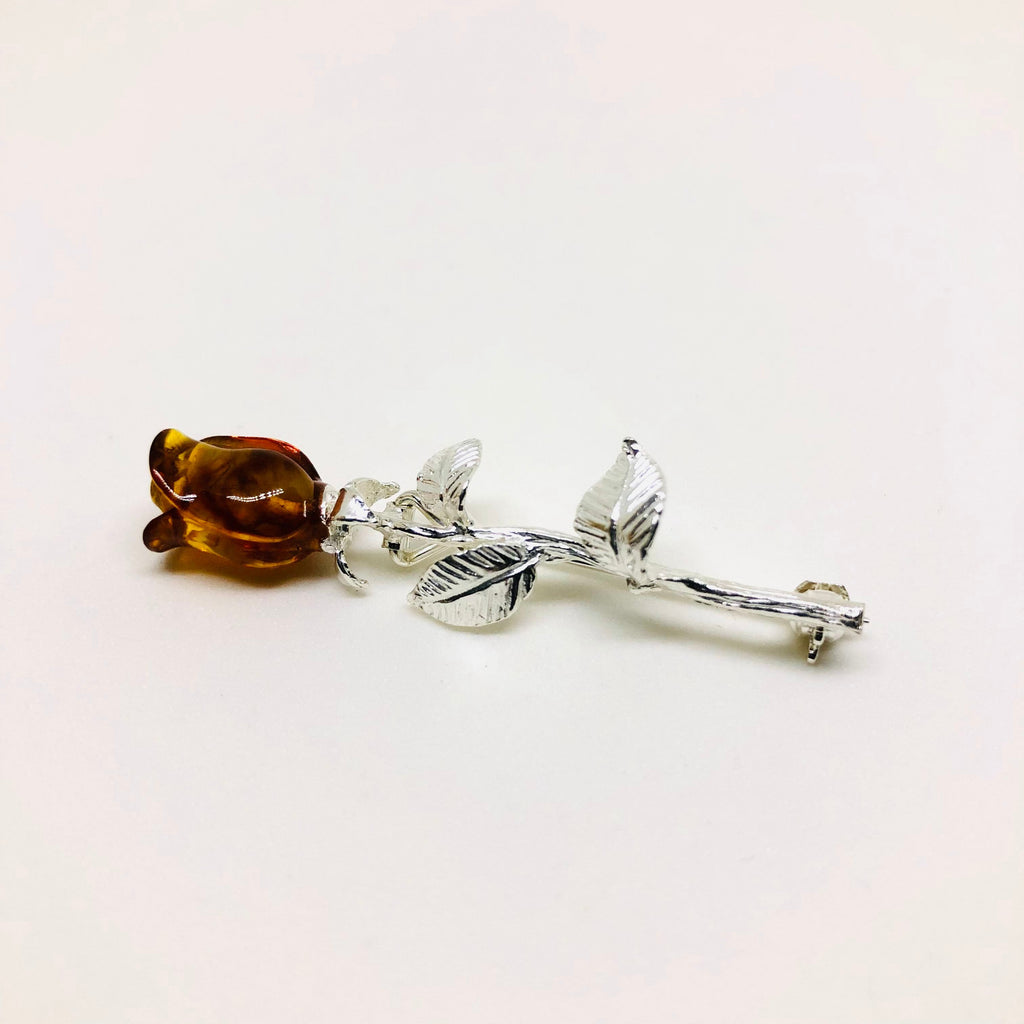 These are very sophisticated, delicate pins made in shiny sterling silver and roses hand-carved in Baltic amber. They are secured with safety clasps.