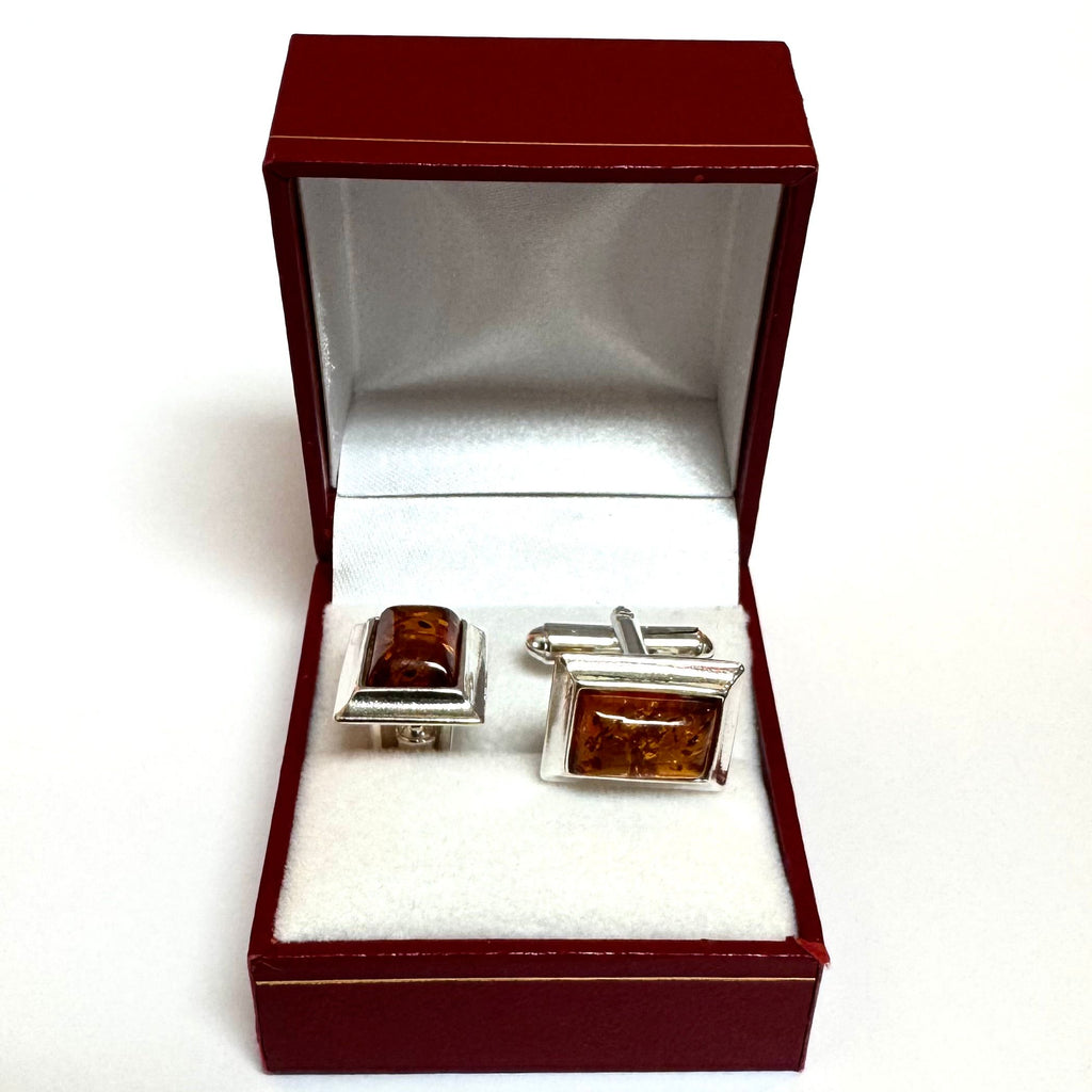 This is an amazing pair of elegant and rich looking cufflinks in silver with large rectangular Baltic amber stones.