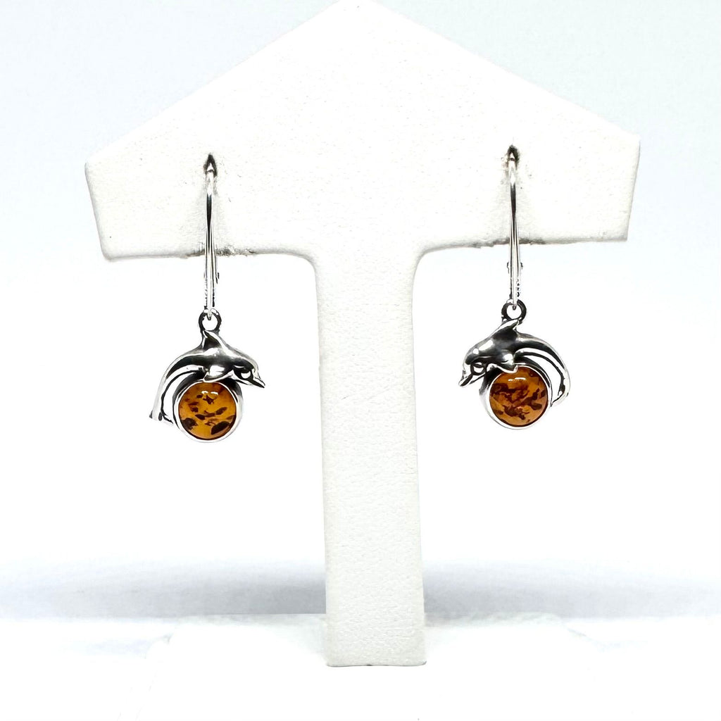 These are sweet amber earrings with a silver dolphin motive on top and European hooks.