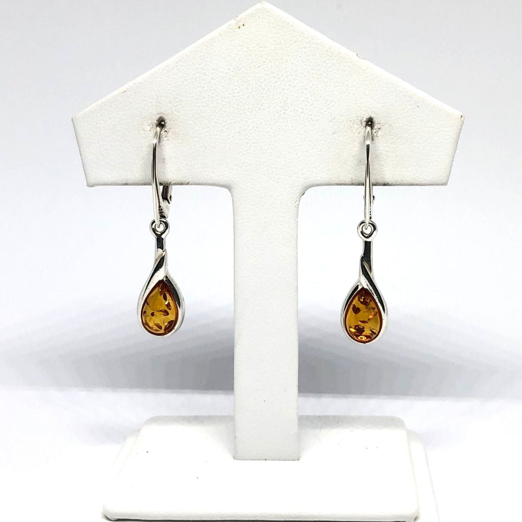 These simple drops of Baltic amber are set in elegant silver setting with European hooks.