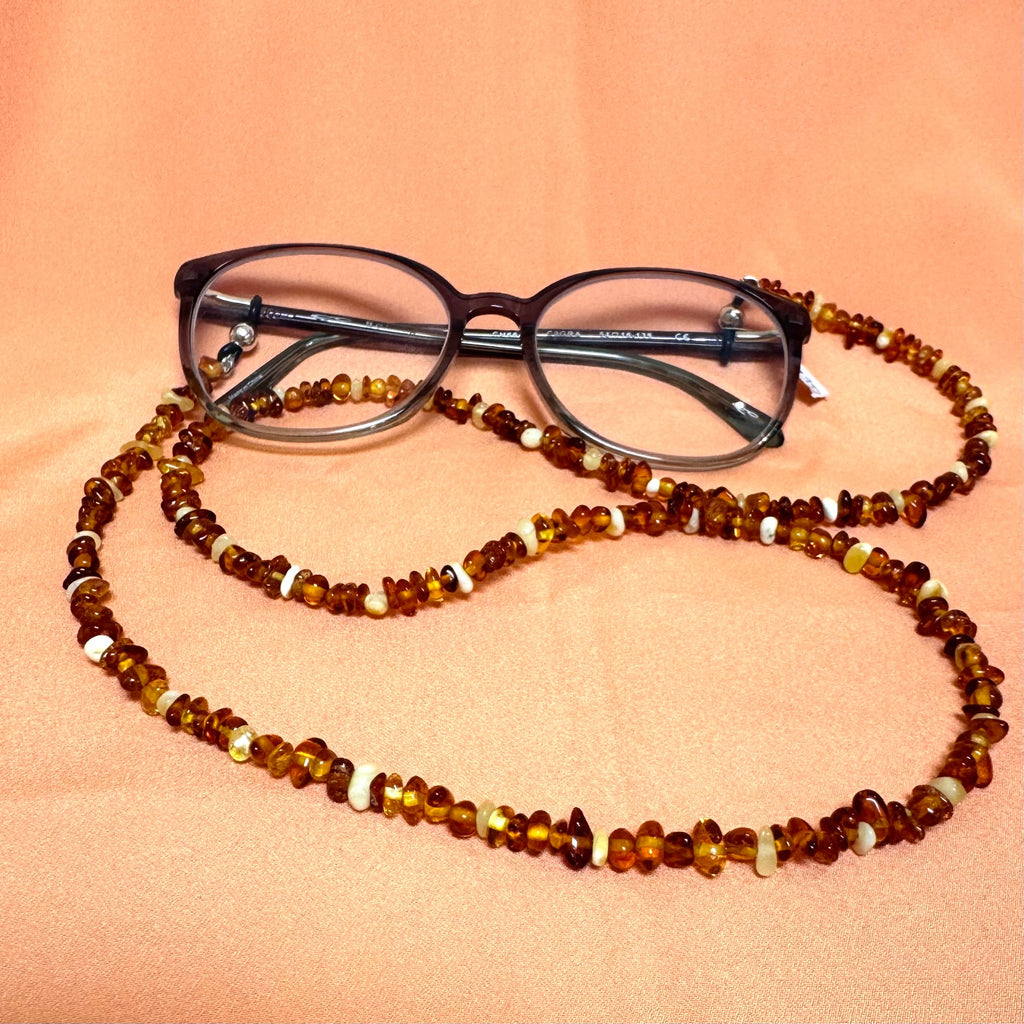 This beaded glasses holder is made of little pieces of Baltic amber in a variety of colours.
