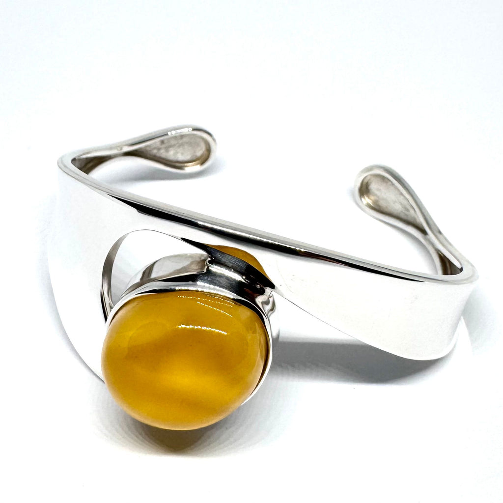 This is an amazing, one-of-a-kind silver cuff in modern style with a large butter amber stone.