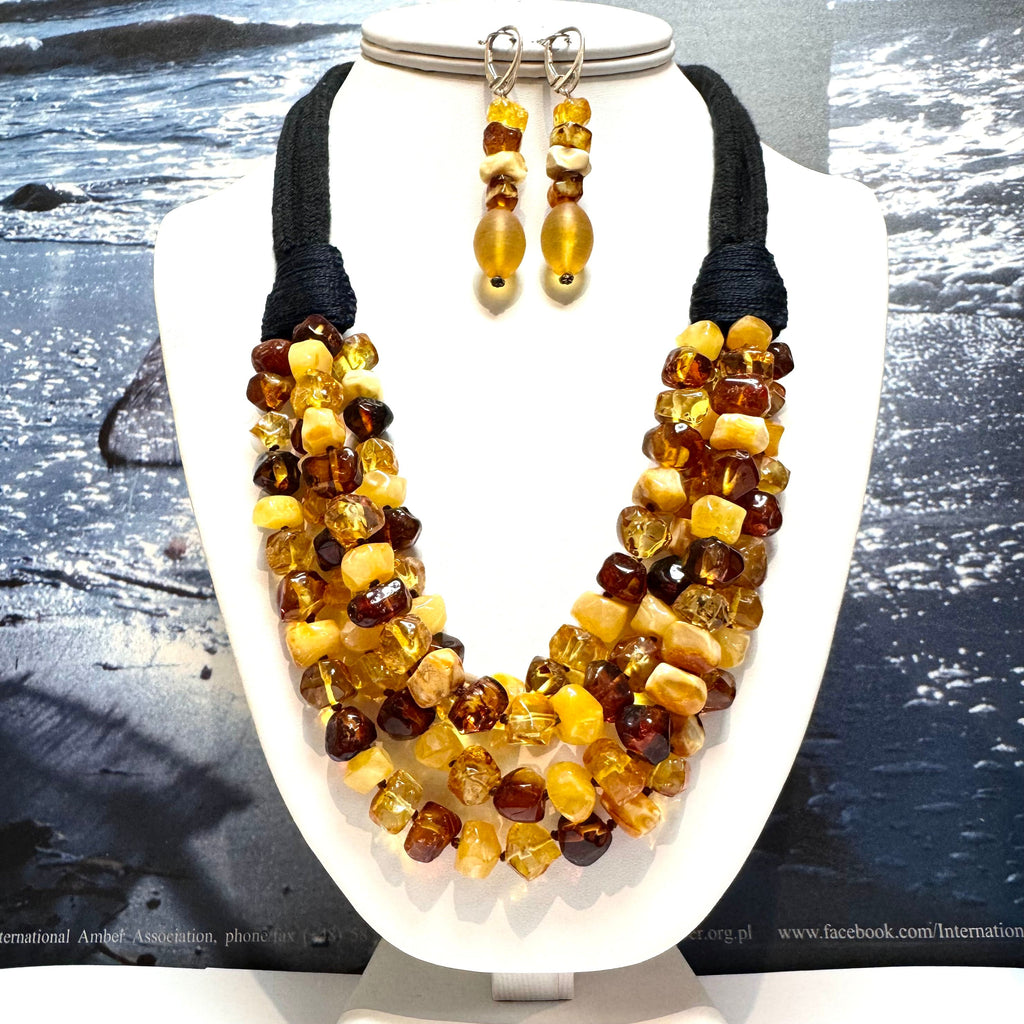 Multistrand Hewed Amber Necklace on Black Cord