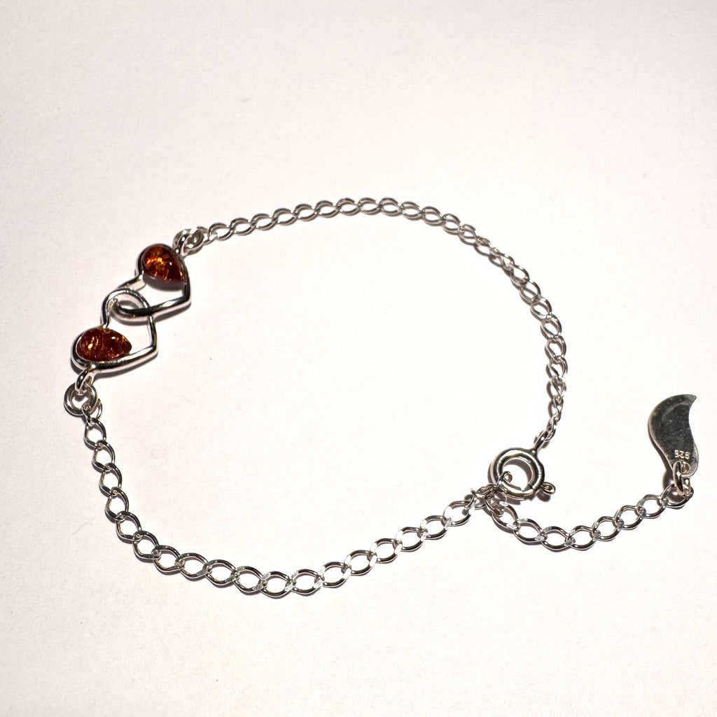 Two Hearts Delicate Silver Bracelet with Amber