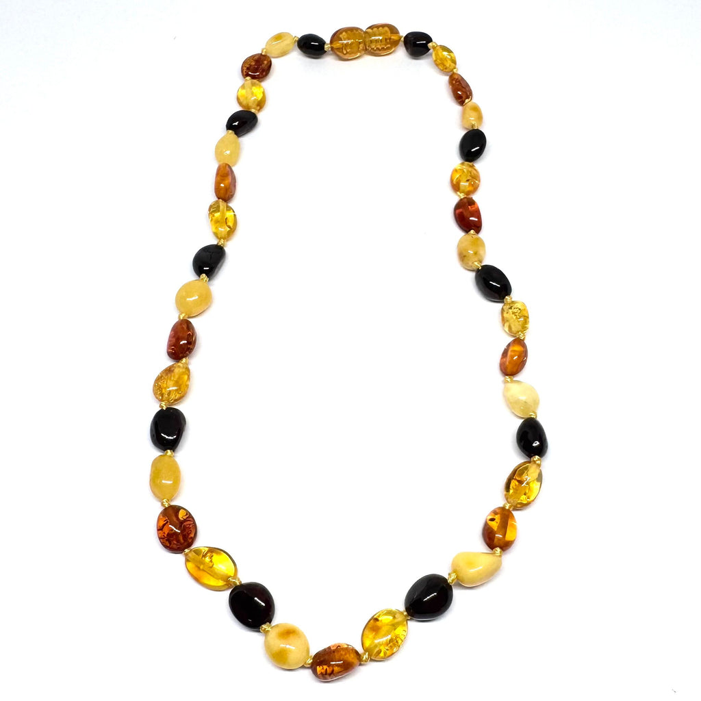 These necklaces come in one, cognac colour of amber (light or dark) or in a variety of amber colours.