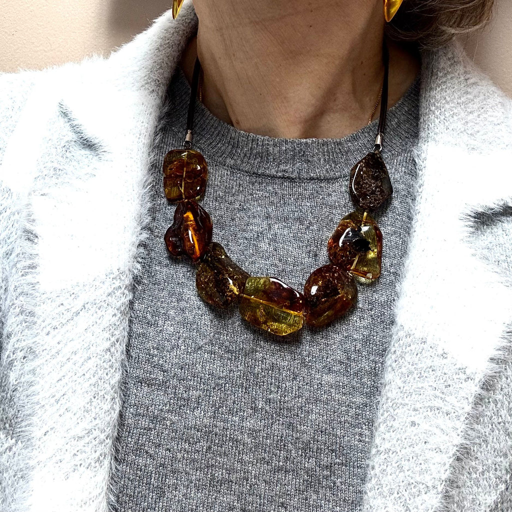 This is an amazing necklace of 7 large amber stones in their natural shapes, polished beautifully, all in greenish tones achieved from some organic matter preserved in each of them.
