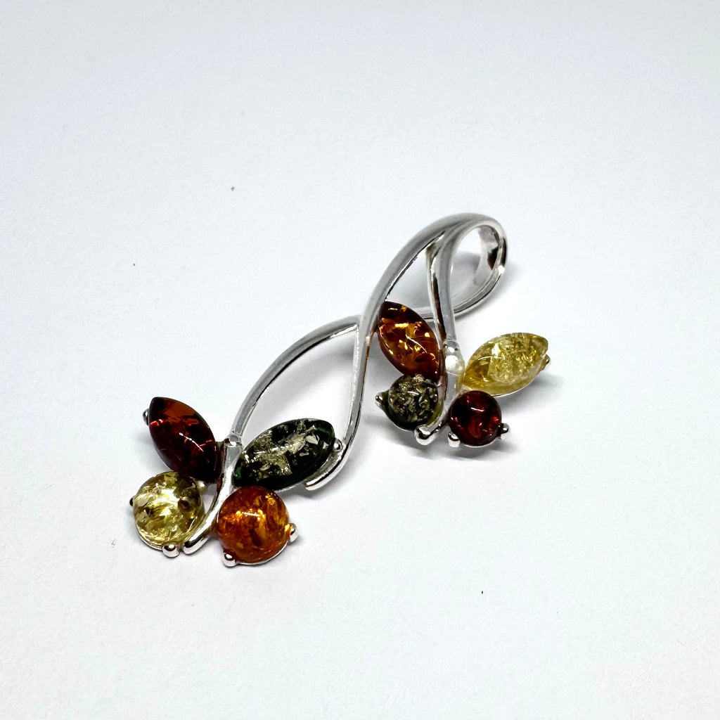 This is an interesting design of a silver branch with 2 butterflies in multicolour amber.