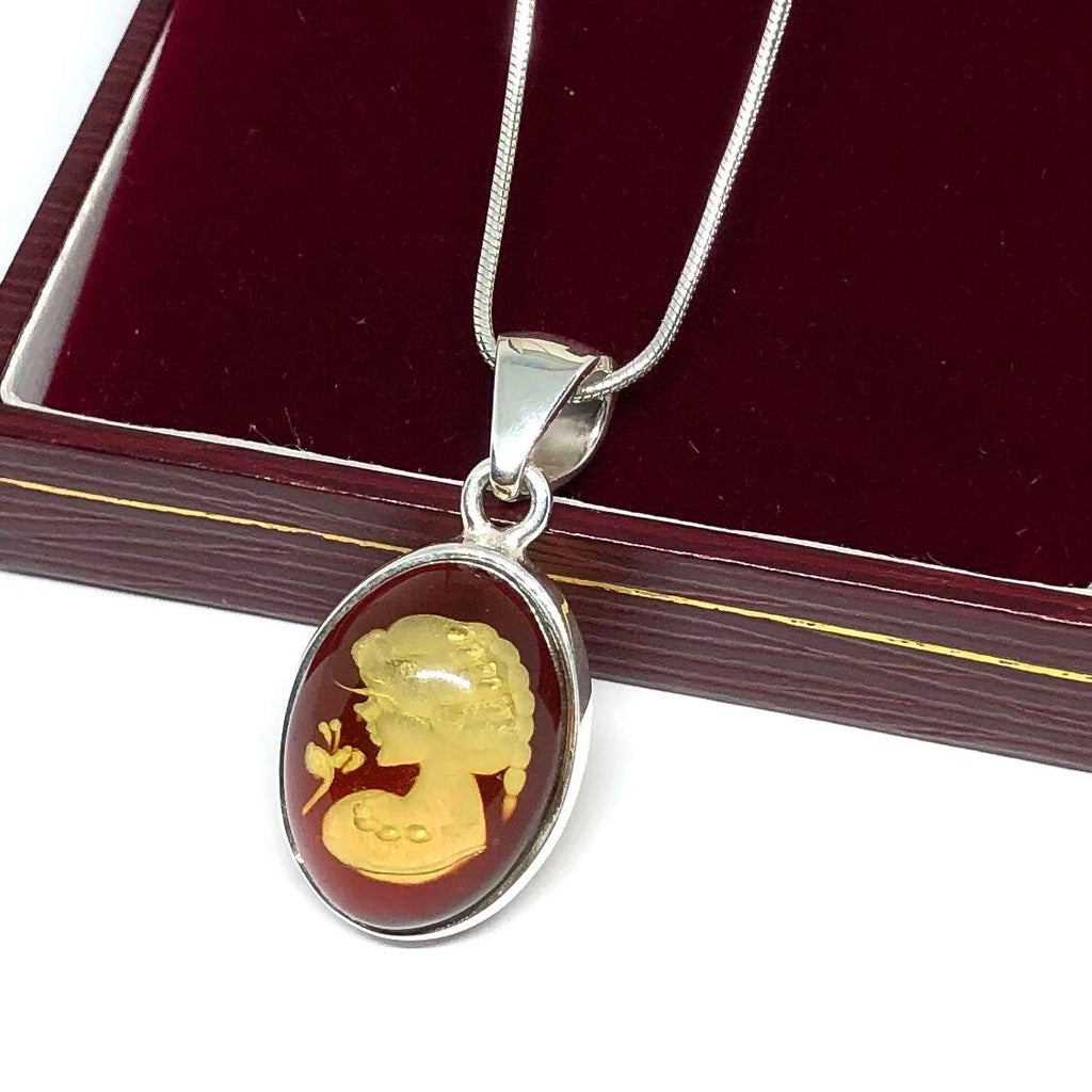 This amber pendant is one of a kind, engraved from the back using "intaglio" method, an Italian tradition. It has to be done by very skilled artist and in a high quality of an amber stone. This one is showing a beautiful lady with a flower.