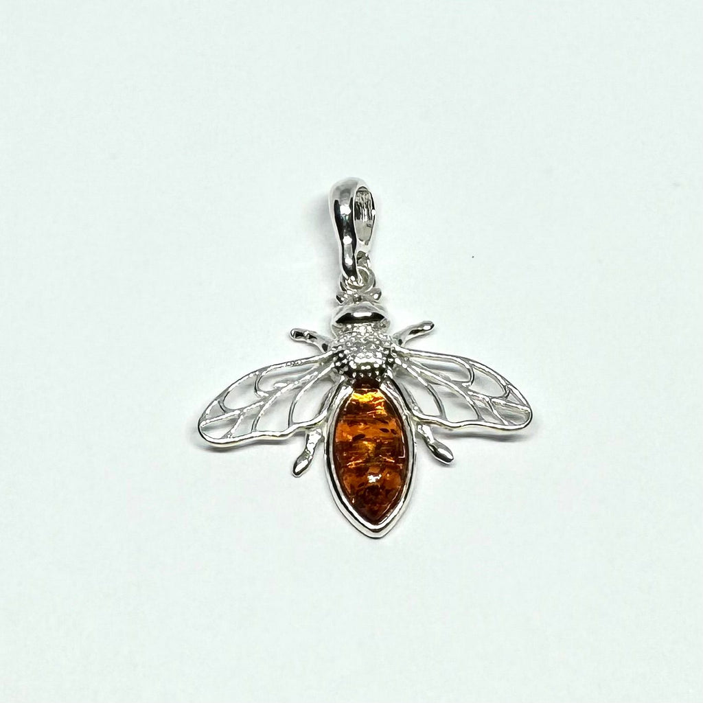 Beautiful design of flying bumblebee in silver and Baltic amber.