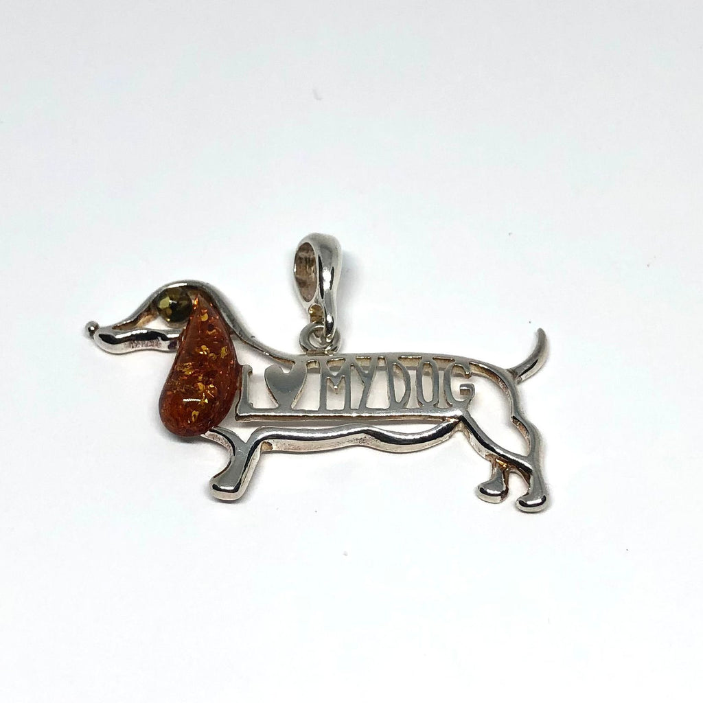 It is hard not to like this cute dachshund pendant, which has "I love my dog" declaration in its silver body and a beautiful amber ear and a green amber eye!