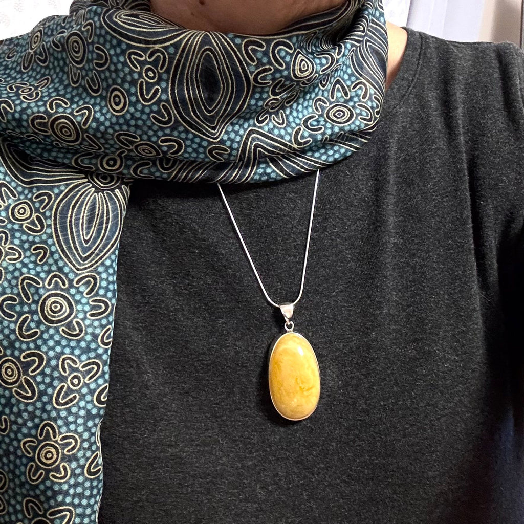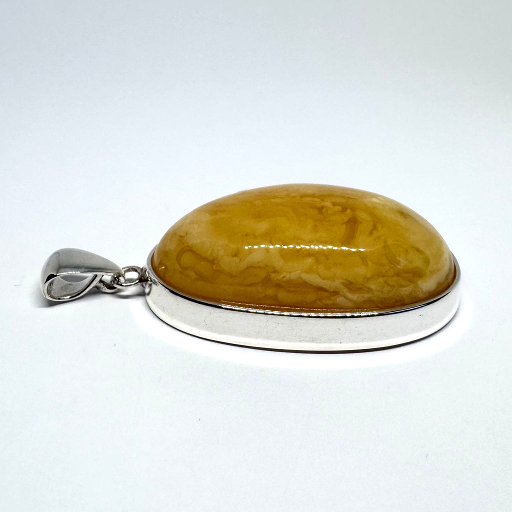 This elegant, simple oval pendant in silver setting is featuring incredibly beautiful, large amber stone in mellow butter colour.