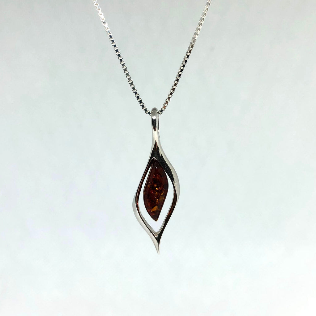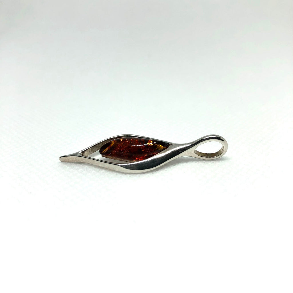 This is a unique design of an amber pendant where elongated and slightly curved stone is framed by silver in the same shape.