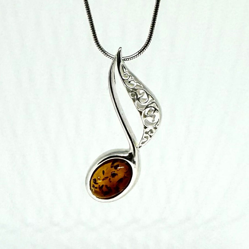This pendant is an artistic vision of a musical note, created in silver with some filigree and with a large Baltic amber stone.