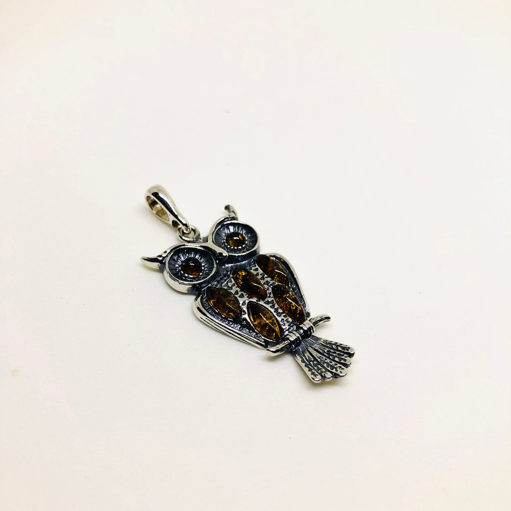 This is a fairly large owl pendant in oxidized silver with amber stones in it's body and eyes.
