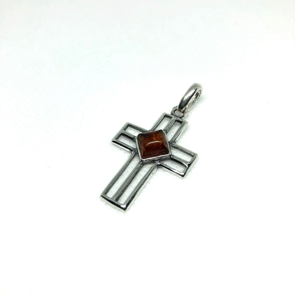 Silver Cross with Amber in Diamond Shape