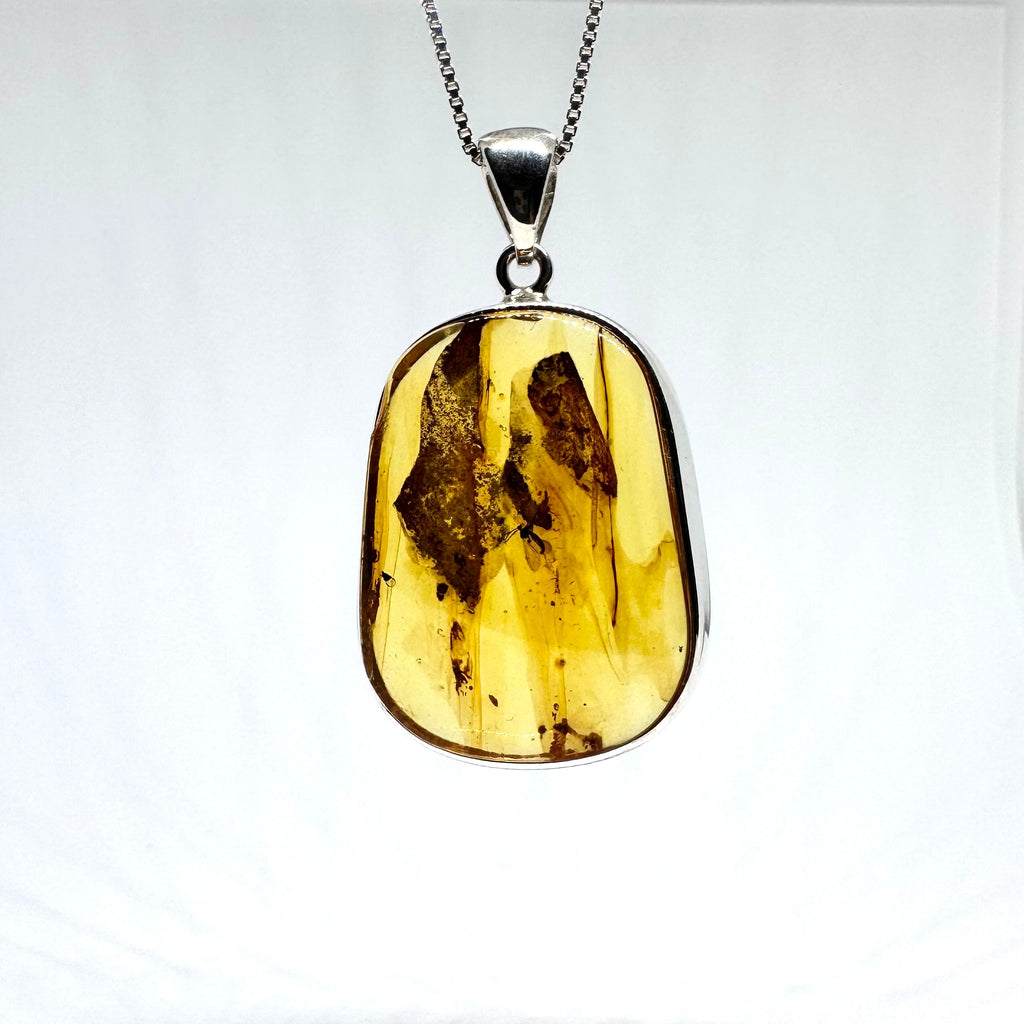 This pendant was created in Lithuania from an interesting piece of Baltic amber which contains prehistoric organic inclusions - 40 million years old pieces of a leaf and a couple of small FIES! This elegant pendant is set in nickel-free sterling silver.