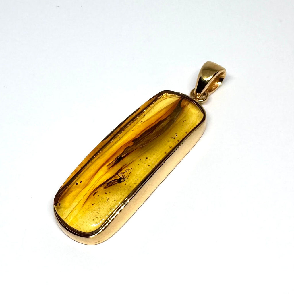 This elegant amber pendant is set in gold-plated sterling silver and it contains an ancient leaf with a well preserved FLY! They were both caught by the resin 40 million years ago and now we can look at them!