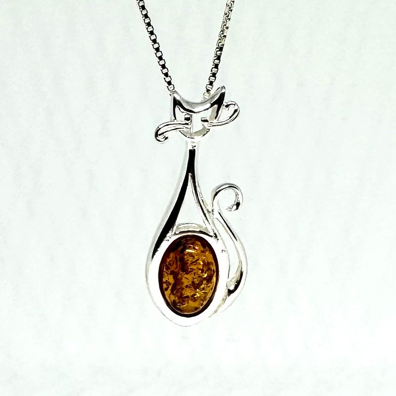 Cat with a Long Mustache Pendant in Amber and Silver