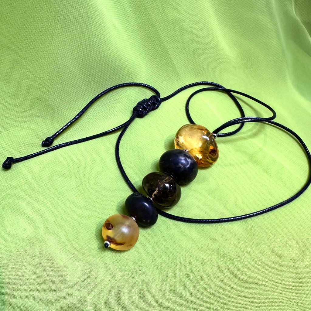 This one-of-a-kind necklace was created with 5 naturally shaped amber balls in a variety of colours and sizes (some finished in mat) on an adjustable black cord.