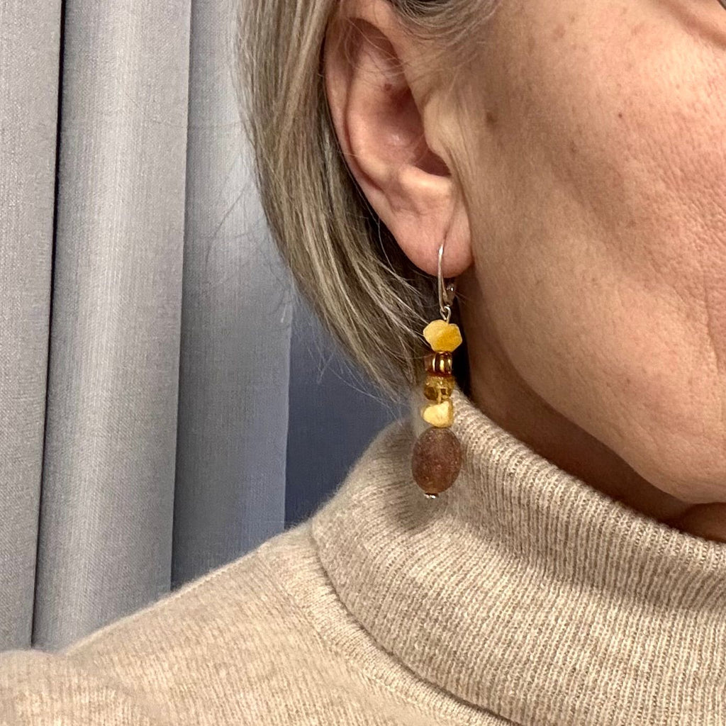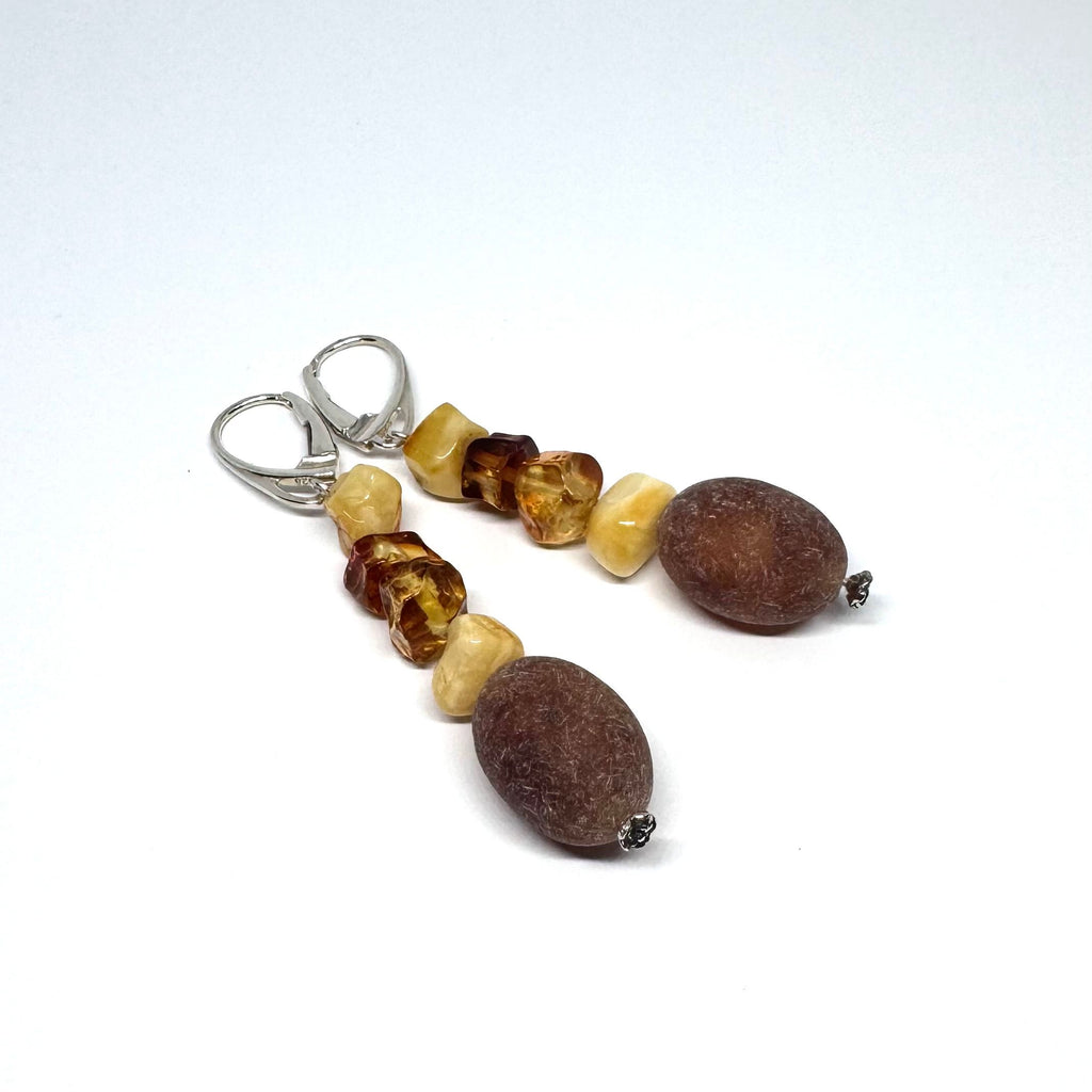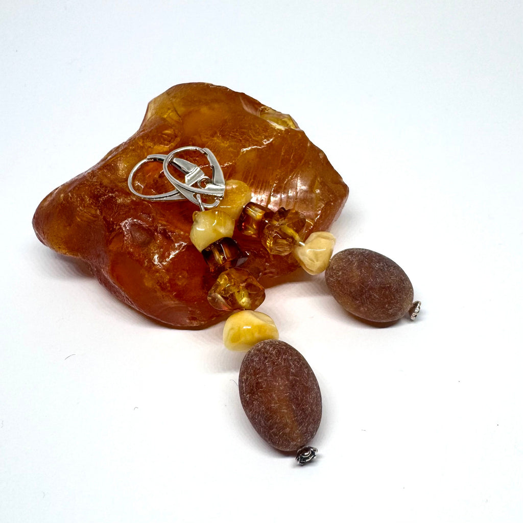 These long amber earrings are featuring large olive-shaped beads finished in mat and some shiny( hammered) amber beads in different colours.